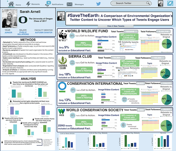 Conducted quantitative content analysis of the Twitter feeds of four major environmental organizations, analyzing successes and opportunities to better engage with their target audiences.